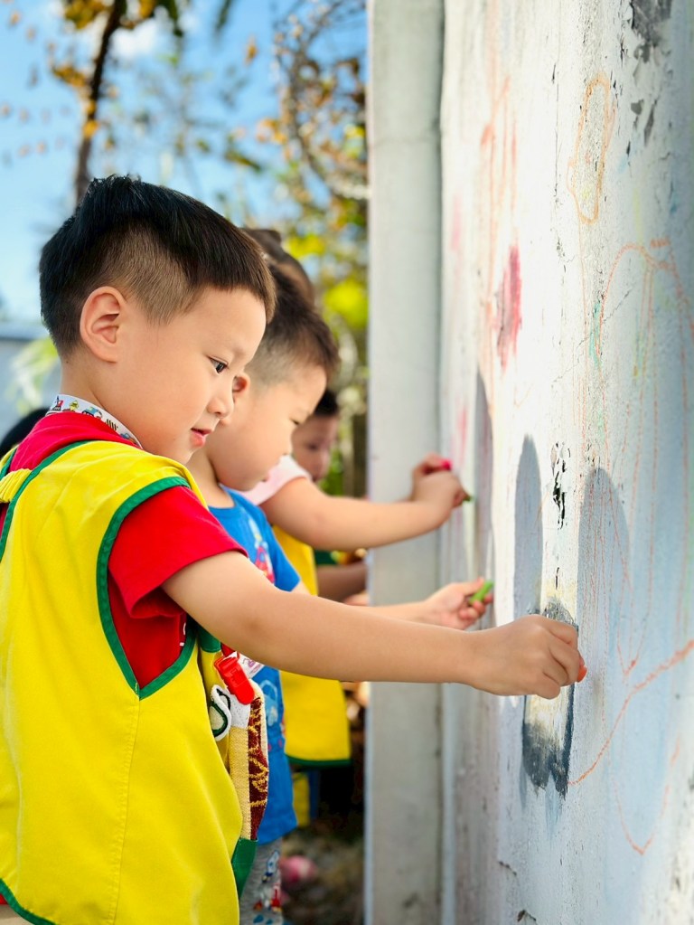 冬日的暖陽下,幼幼寶貝運用粉筆各自發揮其想像力,盡情揮灑繪畫出屬於自己獨特的畫作。提升觀察力與專注力,對幼兒的想像力有正向的發展。