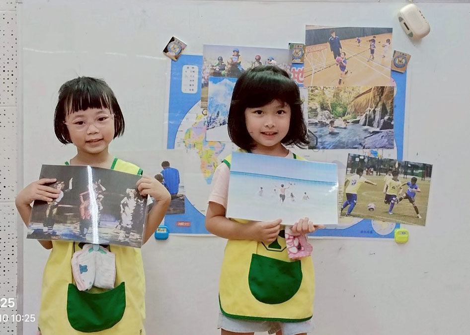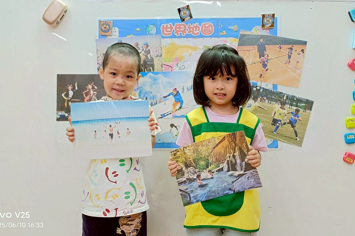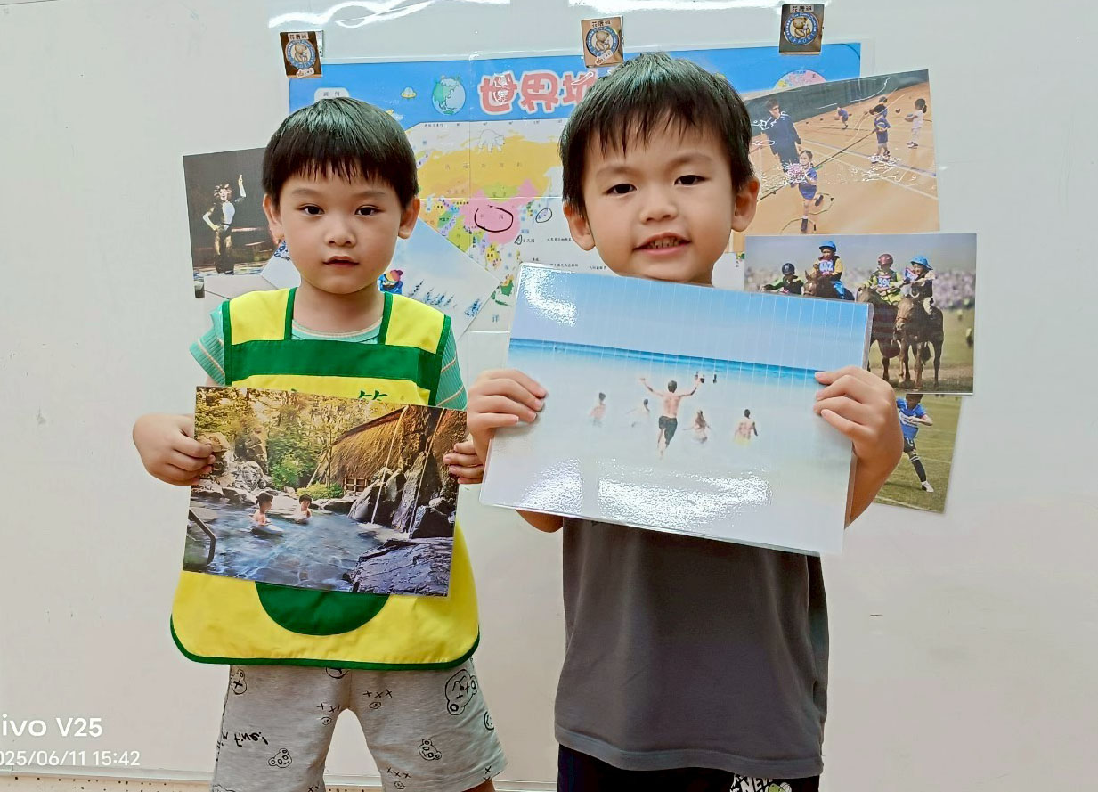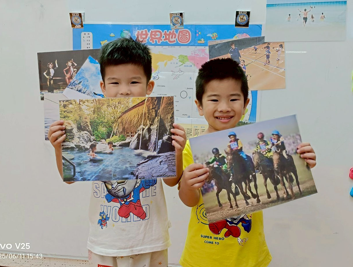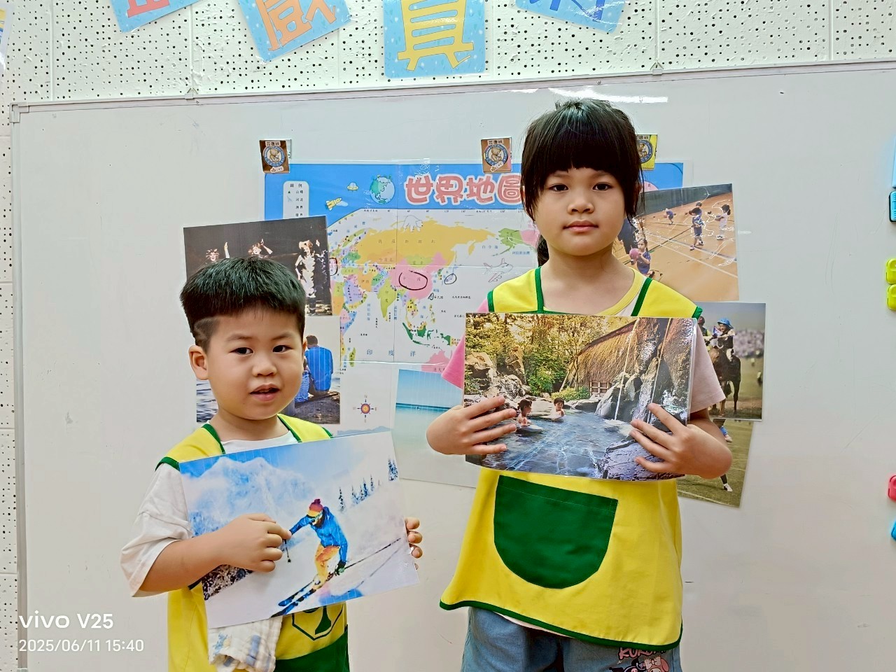 班上小朋友從台灣地圖認識到世界地圖,認識了很多的國家,並藉此分享每個國家因為先天的地理環境、加上文化傳統不同,也會影響到該國家的休閒活動。小朋友認識了很多國家的休閒活動,並體驗日本的泡溫泉、蒙古的騎馬……,爸爸媽媽也可以利用假日帶孩子一起體驗不同的休閒活動唷!