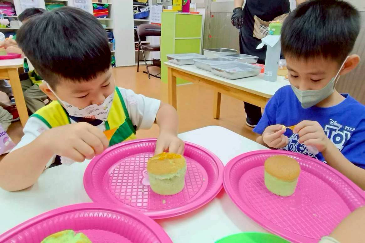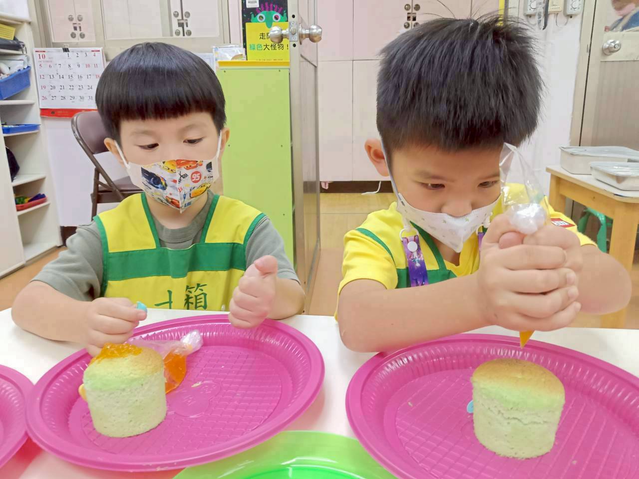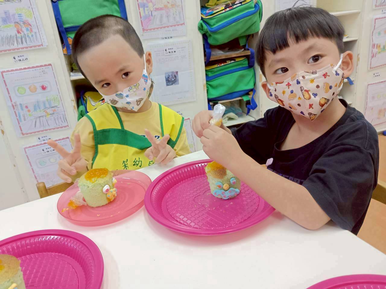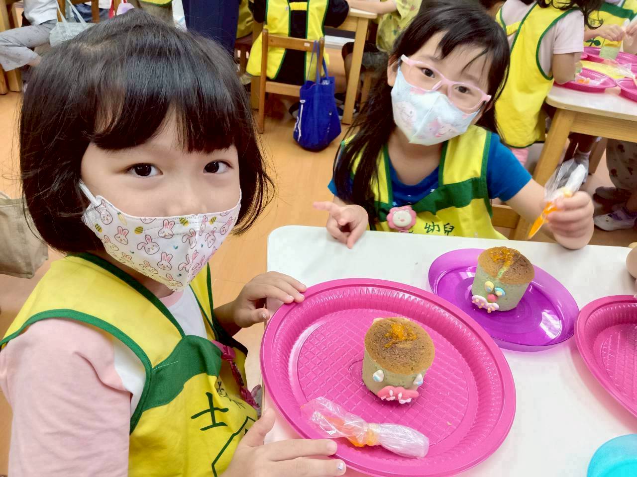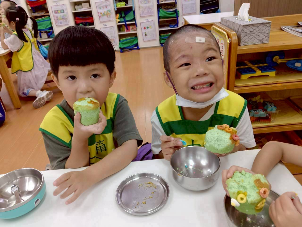 如婷老師帶著葡萄班的小朋友一起上烘焙課,結合繪本《Go Away, Big Green Monster!》,讓孩子們動手做出屬於自己的「小怪獸瑪芬」!孩子們用五彩繽紛的材料裝飾瑪芬,創造出黃眼睛、藍鼻子、綠臉的小怪獸,邊做邊回想故事內容,開心地說著:「Go away, Monster!」
