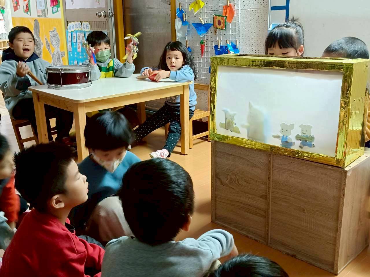利用有趣的皮影戲道具吸引小朋友的目光,接著邀請孩子們輪流上場操作皮影,開心演出《三隻小豬》!表演過程中,小朋友們又專心又投入,現場充滿歡笑聲,氣氛熱鬧又歡樂~接著帶入台語兒歌〈有影咧演戲〉,和孩子們一起唱唱跳跳,並搭配樂器伴奏,讓活動更加豐富有趣!同時也邀請孩子擔任「小老師」,帶領同伴跟著音樂唱跳律動,在互動中提升自信與表現力。透過歡樂的活動,小朋友更認識皮影戲的有趣與特色唷!