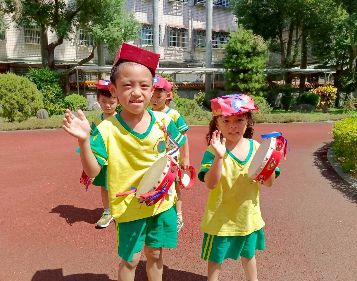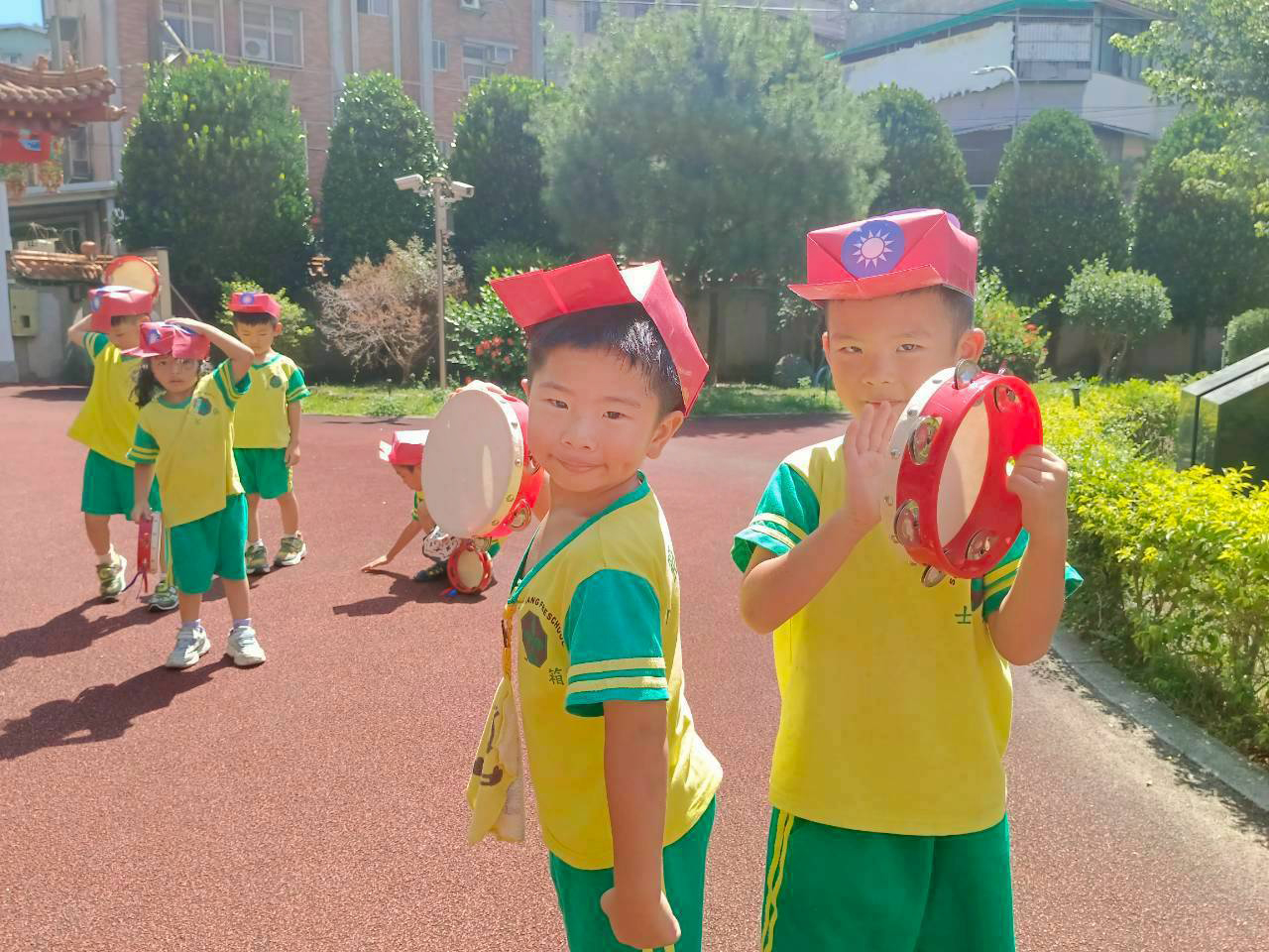 國慶小遊行: 準備小旗子和手搖鈴、鈴鼓和國旗帽,帶領幼兒到校園內操場進行簡單的遊行,讓他們體驗慶祝的熱鬧氣氛並培養團體合作精神。