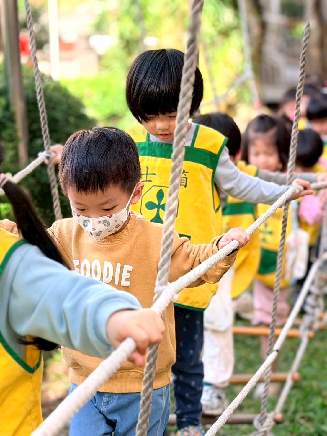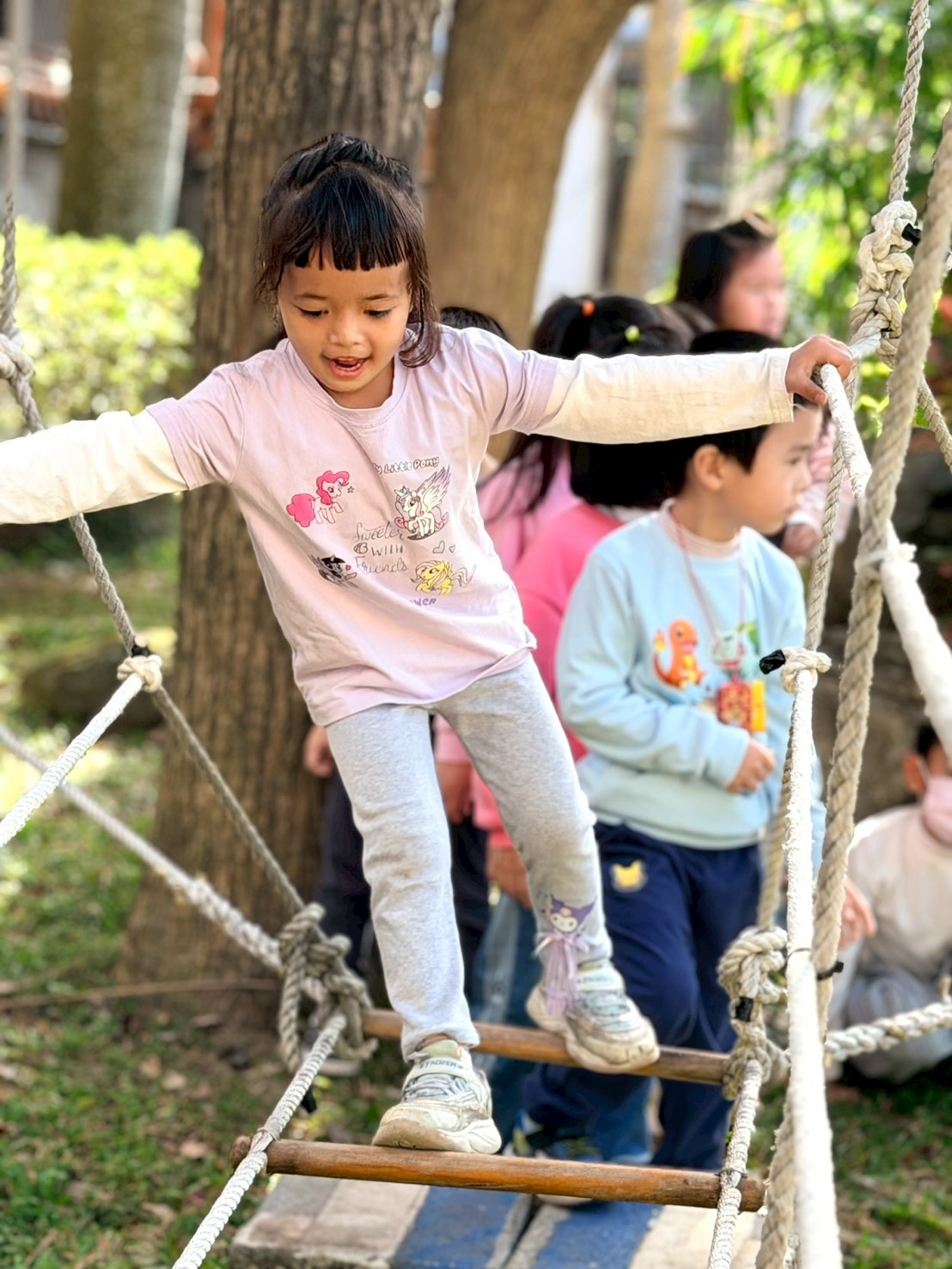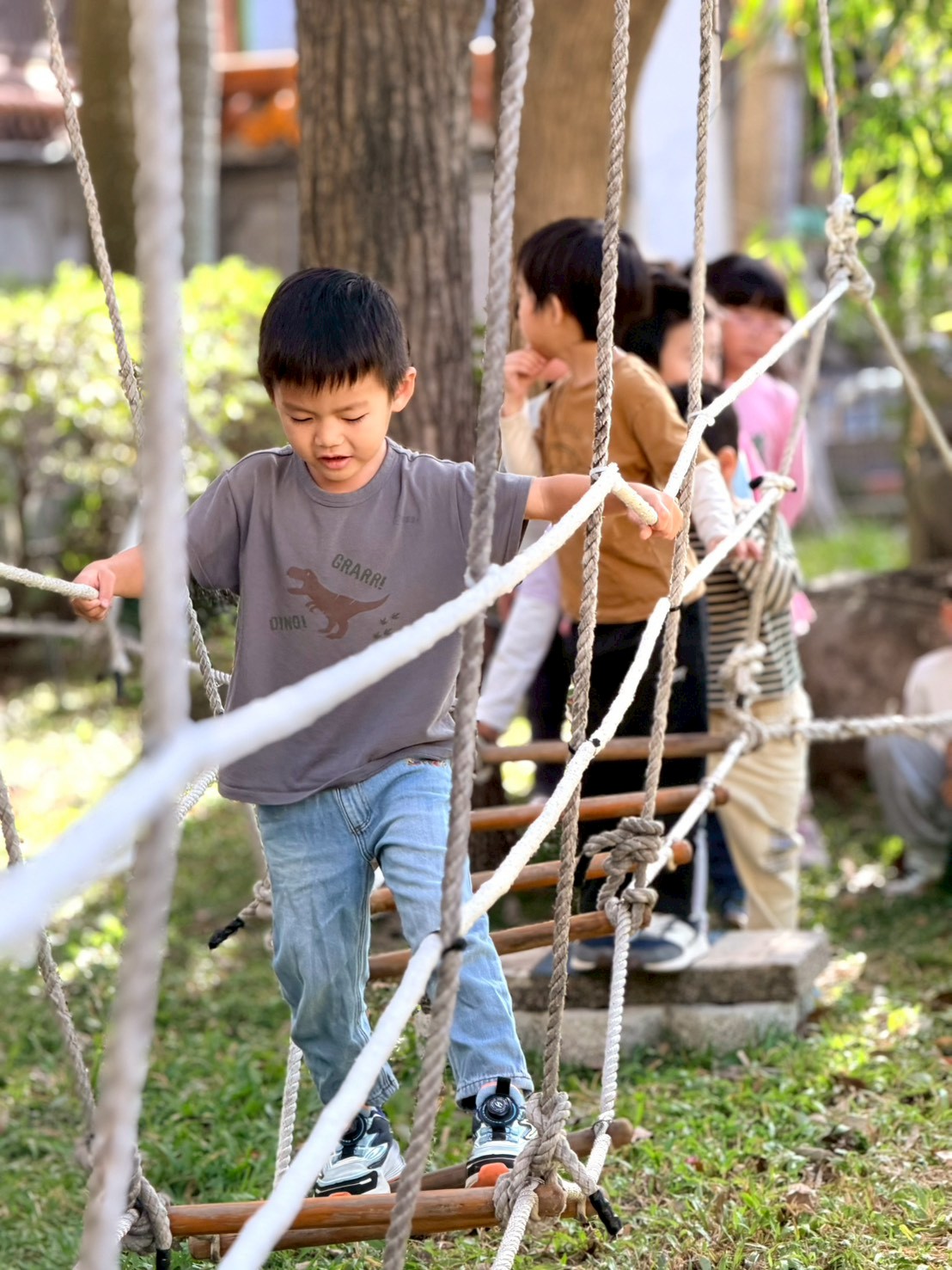 幼兒園的戶外繩索探索,這類活動主要針對 3-6 歲幼兒設計,透過安全的高度與具挑戰性的結構,引導孩子探索身體極限並建立自信。