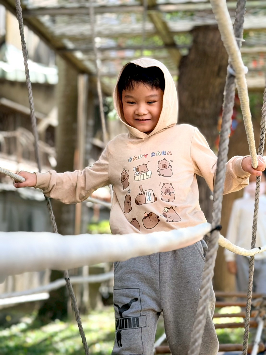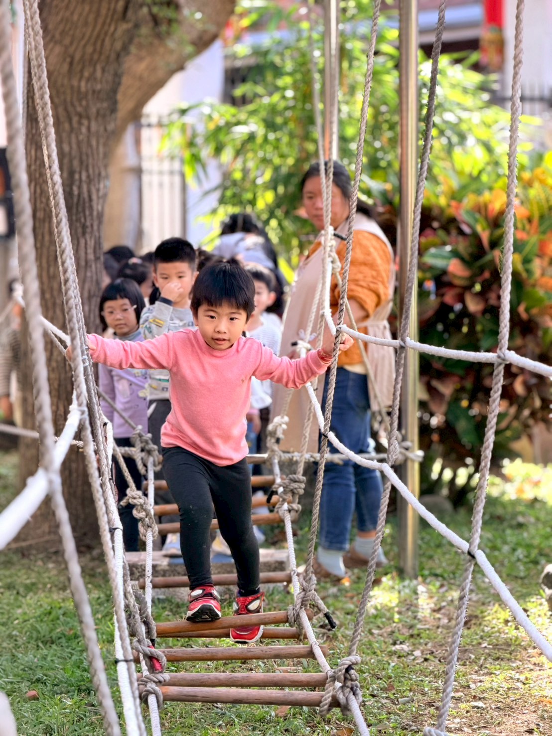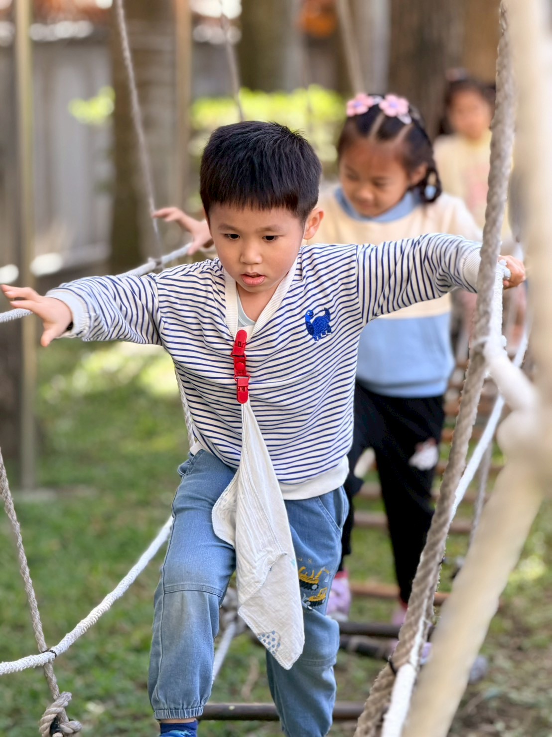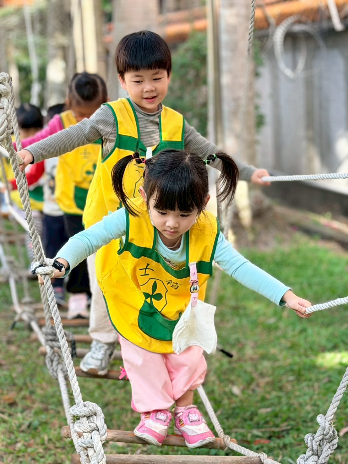 幼兒園的戶外繩索探索,這類活動主要針對 3-6 歲幼兒設計,透過安全的高度與具挑戰性的結構,引導孩子探索身體極限並建立自信。