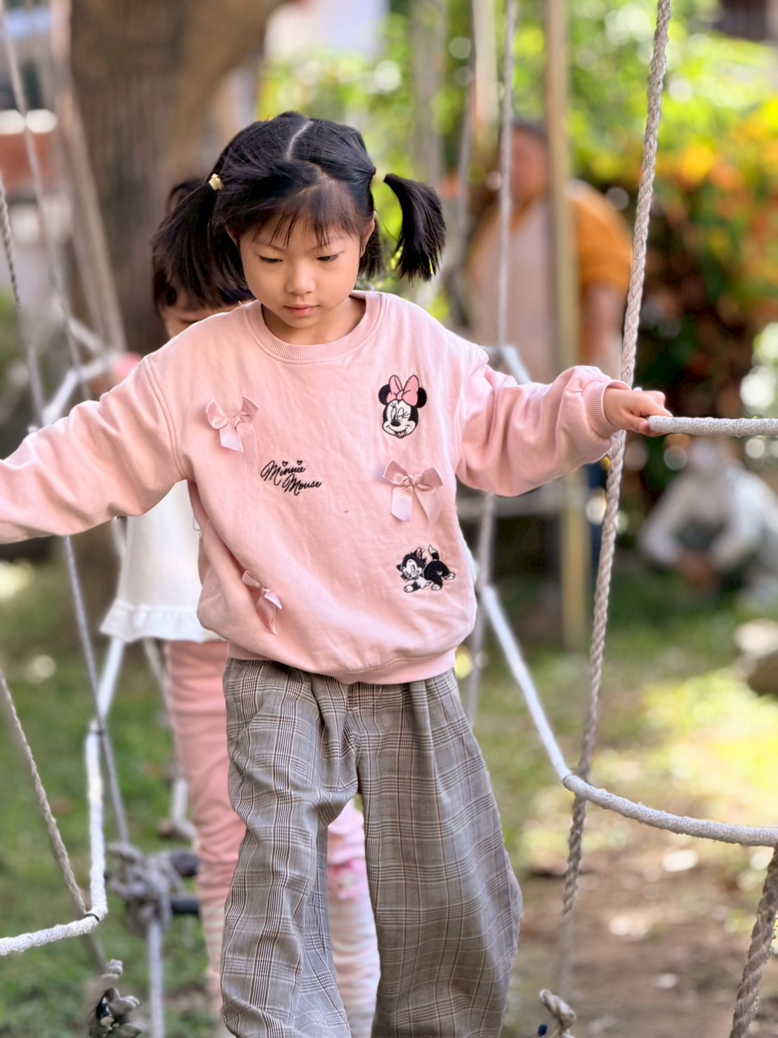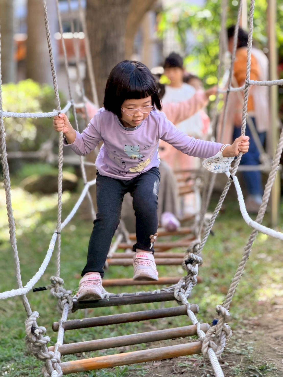 專注力與問題解決: 孩子在不穩定的繩索上需要高度專注以維持平衡,並思考如何安全地移動到下一點。
